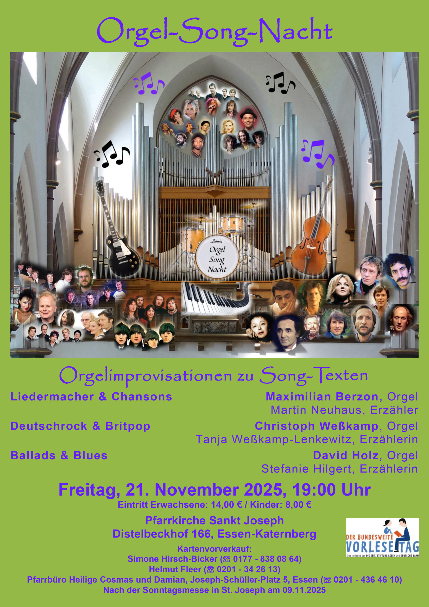 Mit diesen Texten, mit passenden Bildern und vor allem mit Orgelklängen, die diese Texte interpretieren und ausdeuten – wobei nicht auszuschließen ist, dass die Organisten auch das ein oder andere Thema der Song-Vorlagen aufgreifen und einfließen lassen – gehen unsere Orgel-Literatur-Nächte in die zwölfte Runde. Und so laden wir Sie am 21. November 2025 um 19:00 Uhr in die Kirche St. Joseph ein. Drei ausgezeichnete Organisten und drei versierte Erzähler bzw. Erzählerinnen stehen für Sie bereit, um zu zeigen, dass es auch in der modernen Musiker-Szene ernstzunehmende Autoren, um nicht zu sagen Dichter, gibt. Und Lieder mit sinnvollen Texten, die einem selbst vielleicht aus der Seele sprechen, hört man eigentlich ja auch viel lieber!