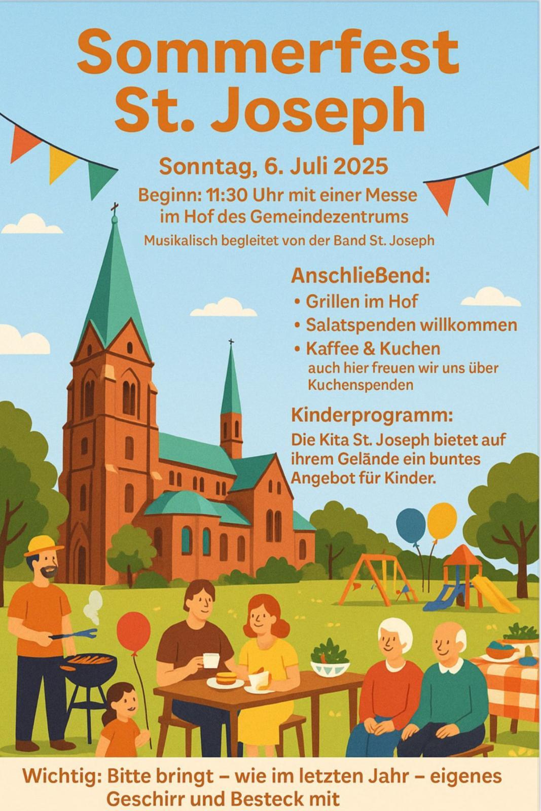 Am Sonntag, 6. Juli, lädt unsere Gemeinde St. Joseph in Katernberg herzlich zum Sommerfest auf dem Außengelände des Gemeindezentrums (Termeerhöfe 10) ein. Beginn ist um 11:30 Uhr mit einem Gottesdienst im Hof des Gemeindezentrums, der musikalisch von der Band St. Joseph begleitet wird.