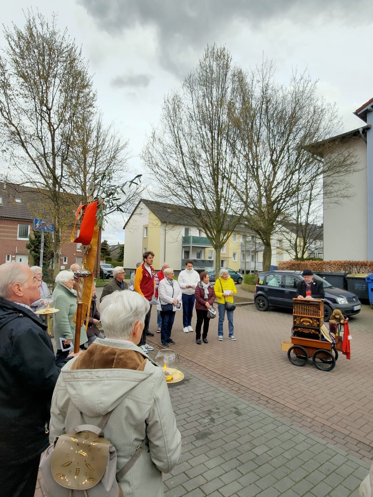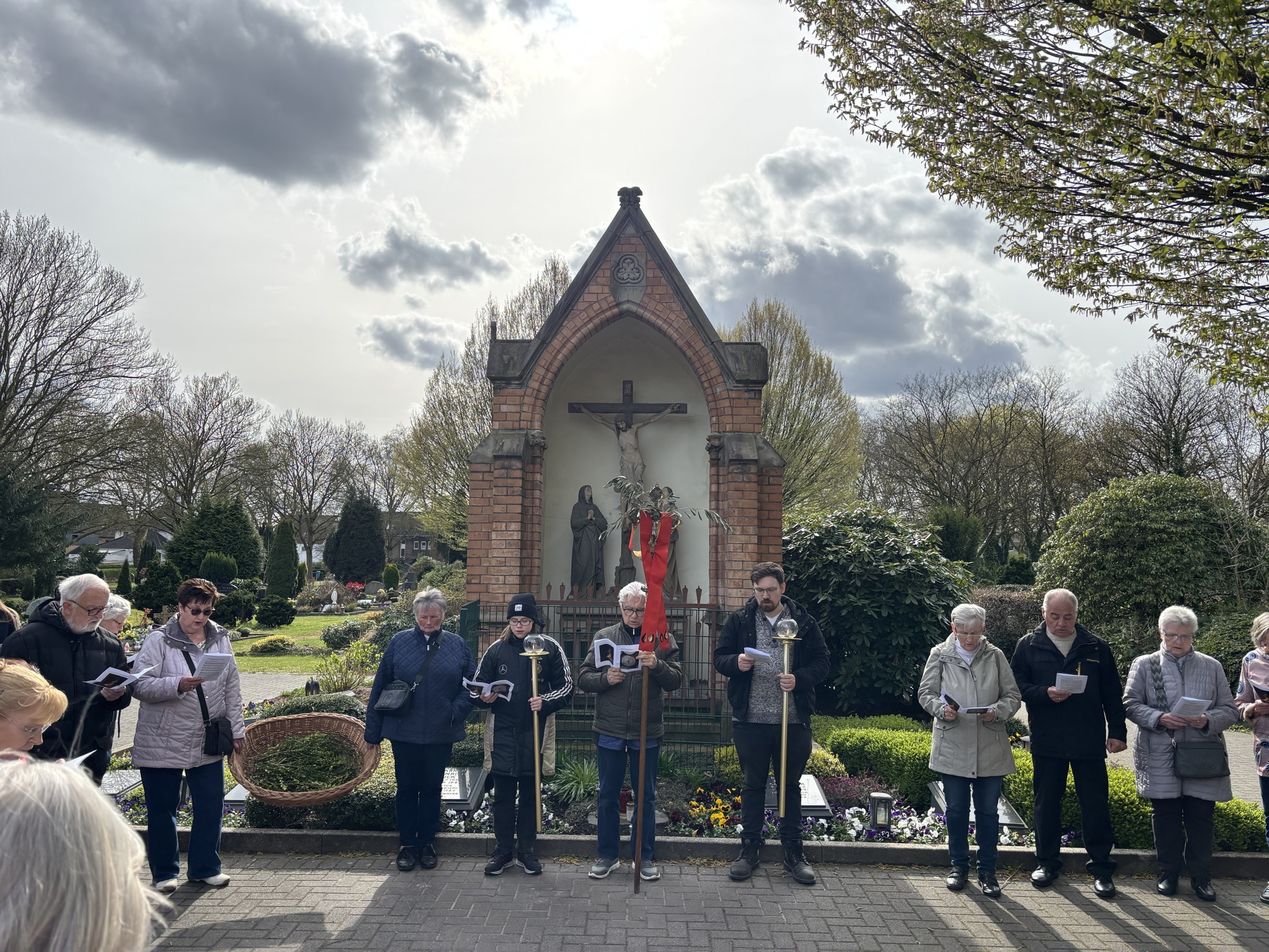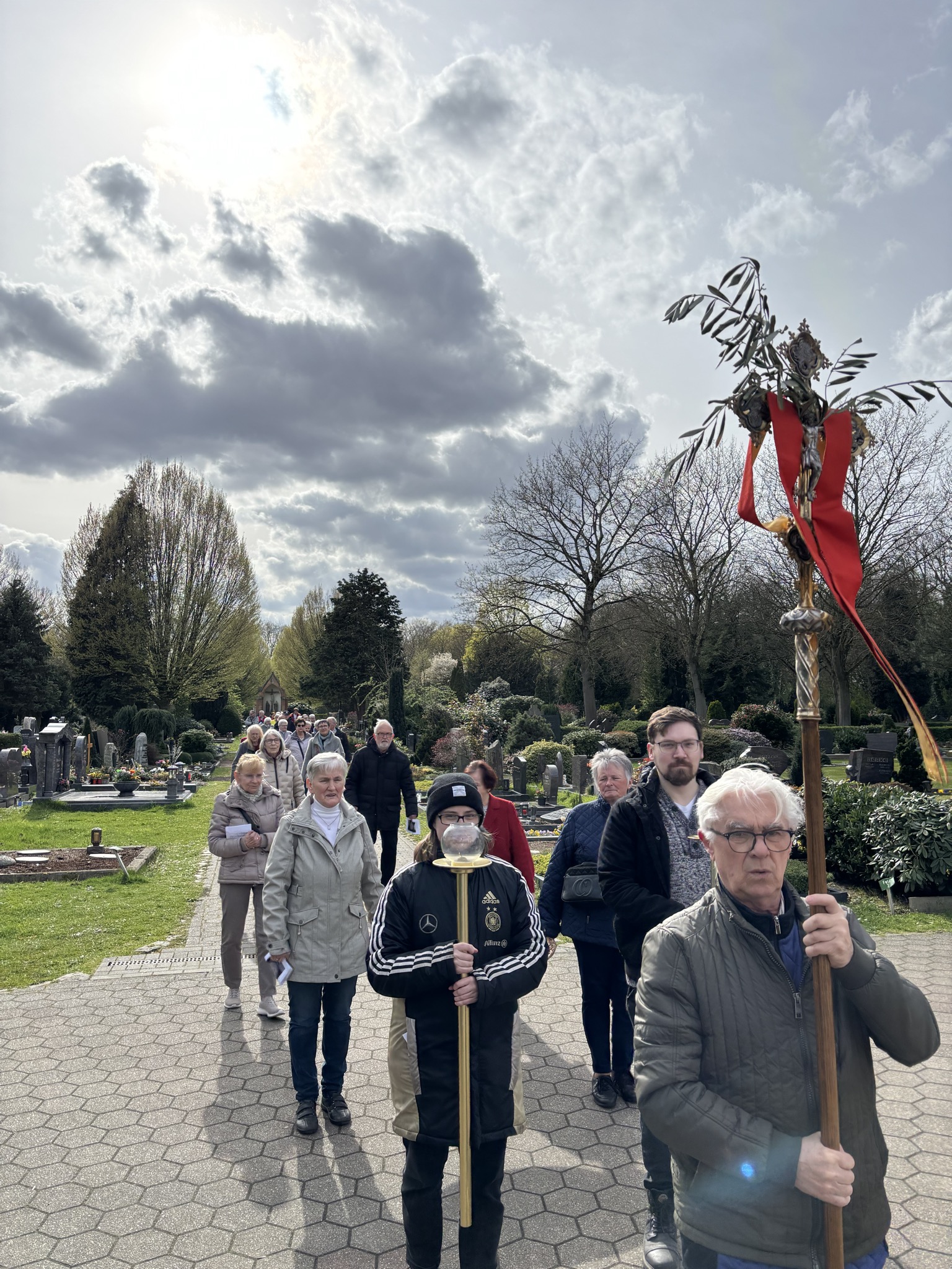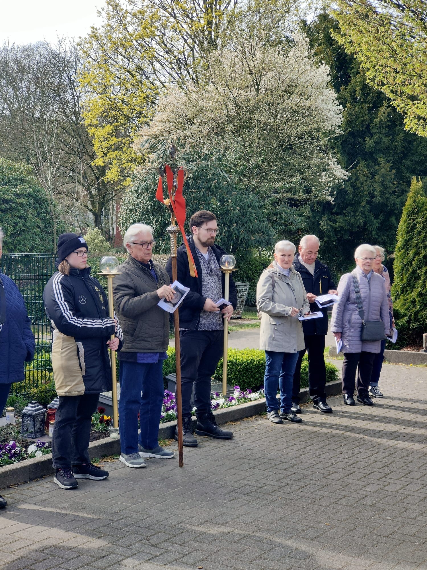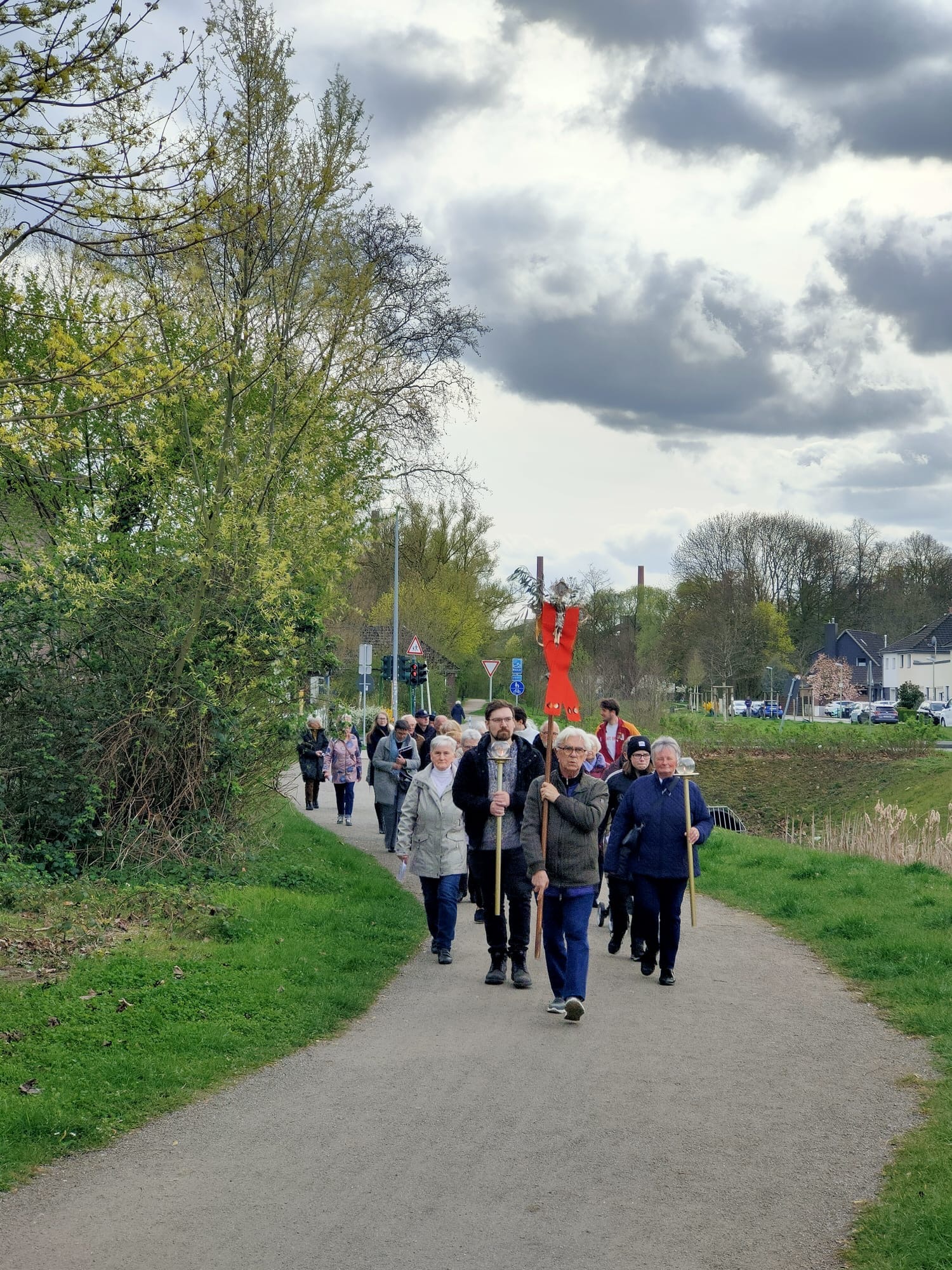 Der Weg führte durch die Straßen Katernbergs mit Stationen unter anderem auf dem katholischen Friedhof, an der Grundschule an der Viktoriastraße, im Louise-Schröder-Zentrum sowie an den Altenwohnungen am Ottenkampshof. Die Station im Louise-Schröder-Zentrum wurde auch von Bewohnerinnen und Bewohnern der Einrichtung besucht und es wurde gemeinsam gesungen. Passend zum Palmsonntag verteilten die Teilnehmenden in der Einrichtung gesegnete Palmenzweige.