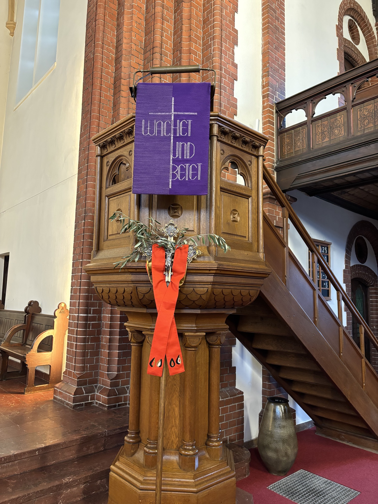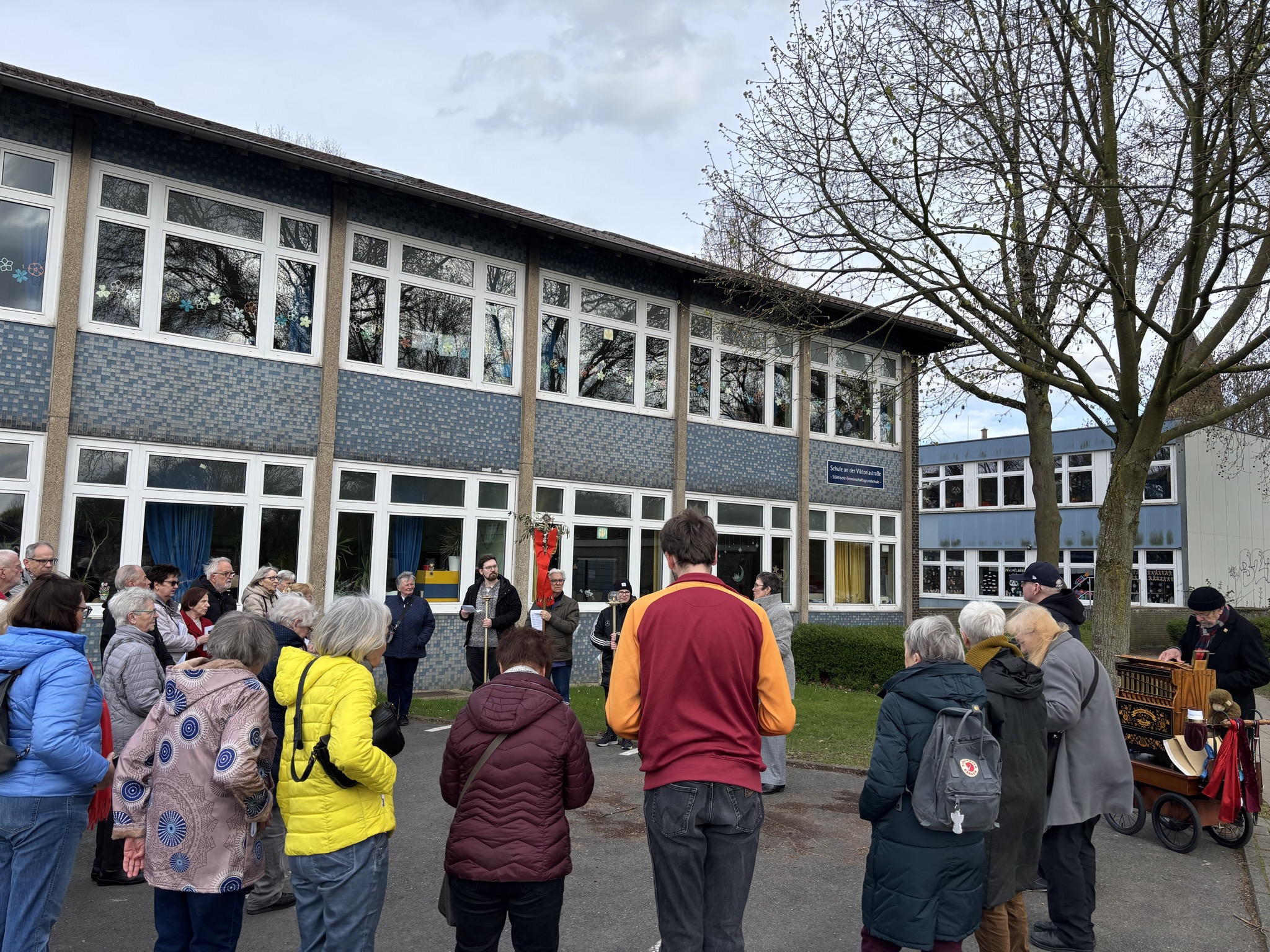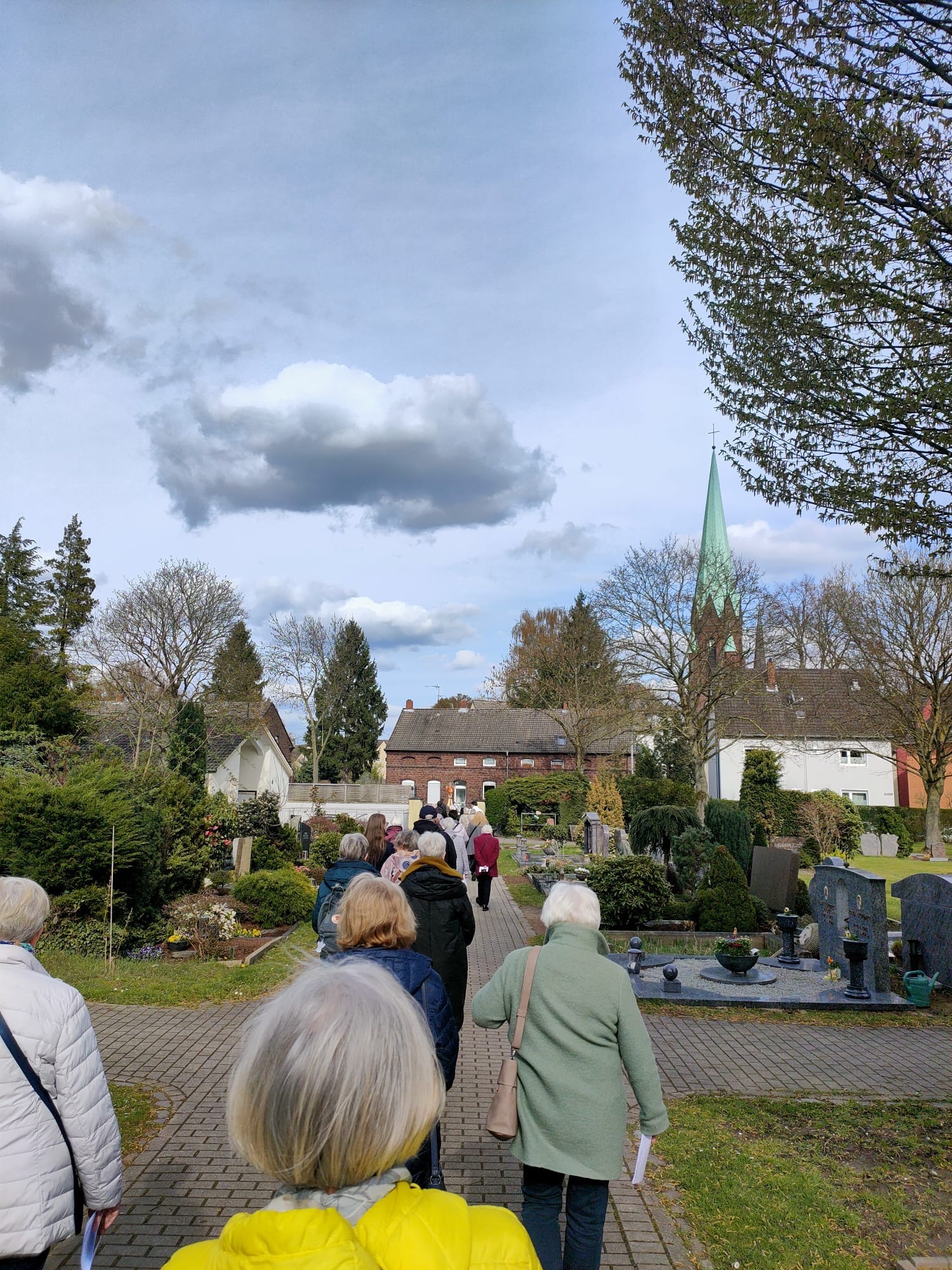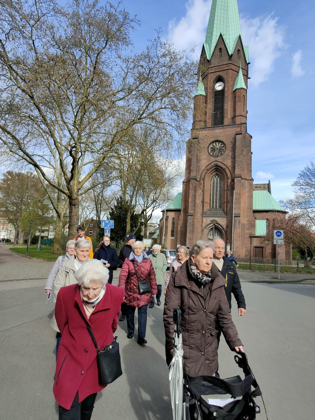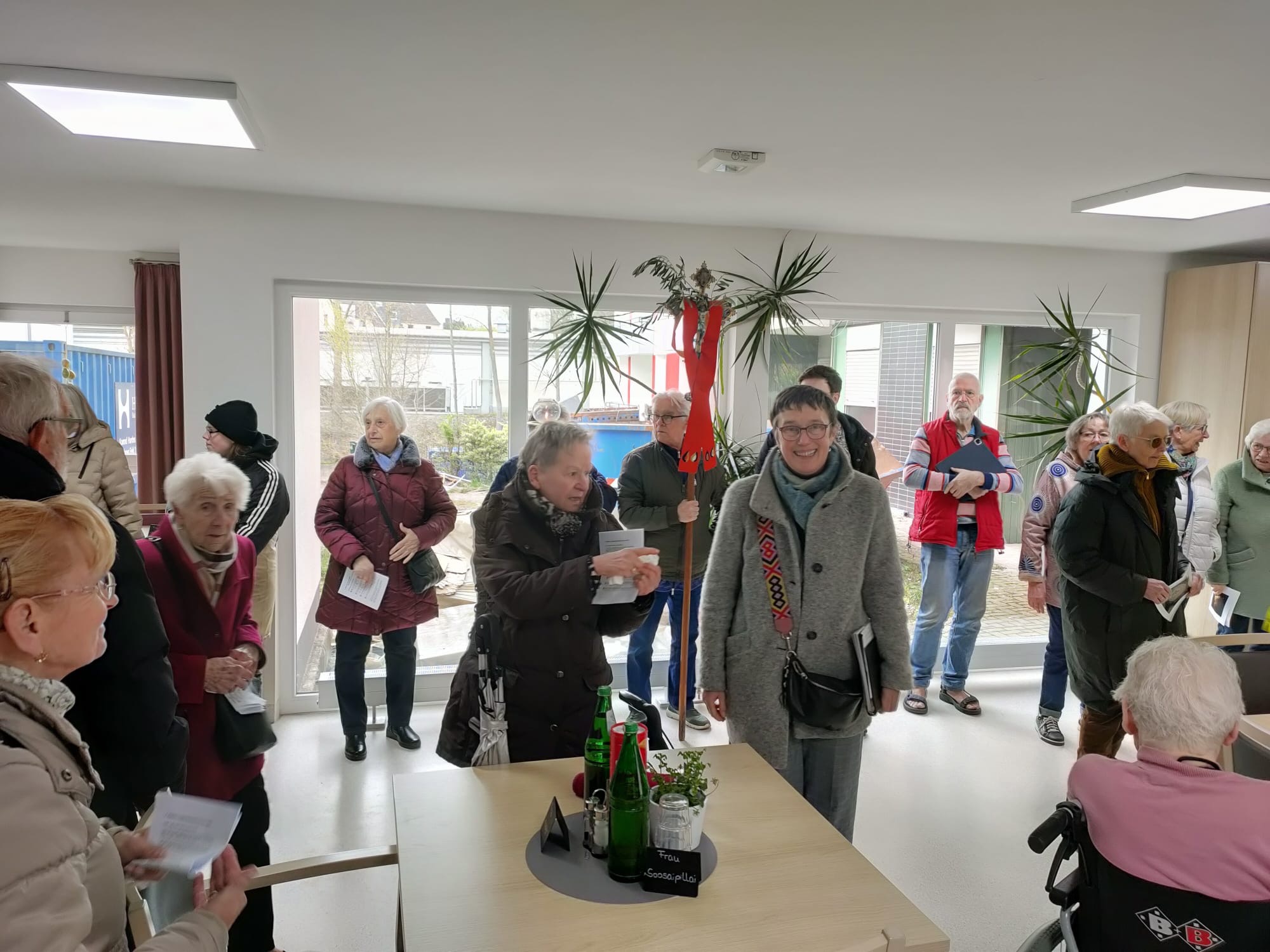 Der Weg führte durch die Straßen Katernbergs mit Stationen unter anderem auf dem katholischen Friedhof, an der Grundschule an der Viktoriastraße, im Louise-Schröder-Zentrum sowie an den Altenwohnungen am Ottenkampshof. Die Station im Louise-Schröder-Zentrum wurde auch von Bewohnerinnen und Bewohnern der Einrichtung besucht und es wurde gemeinsam gesungen. Passend zum Palmsonntag verteilten die Teilnehmenden in der Einrichtung gesegnete Palmenzweige.