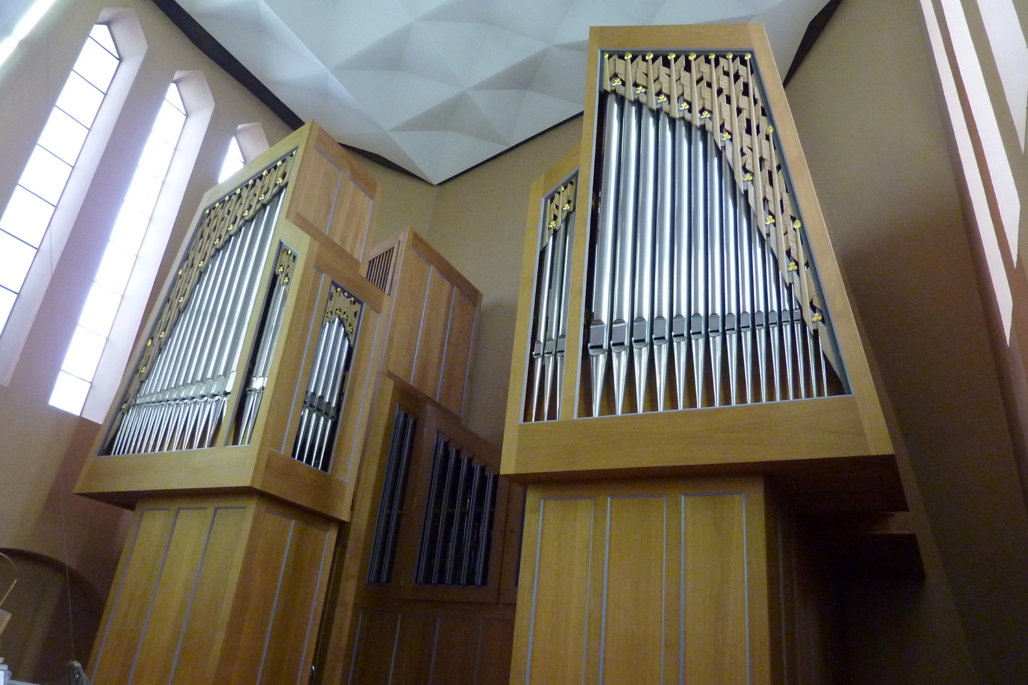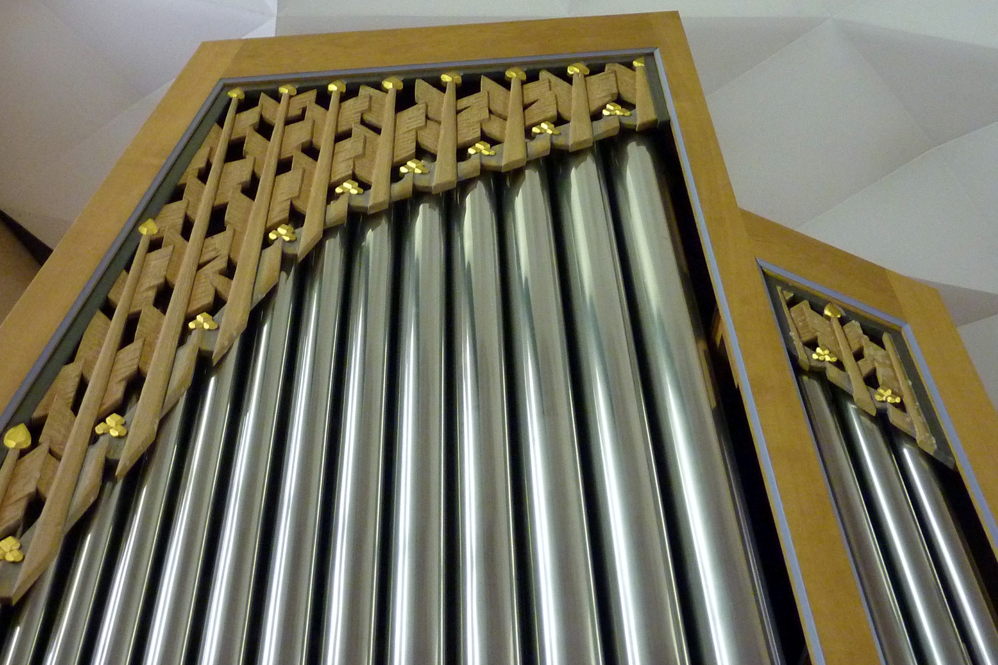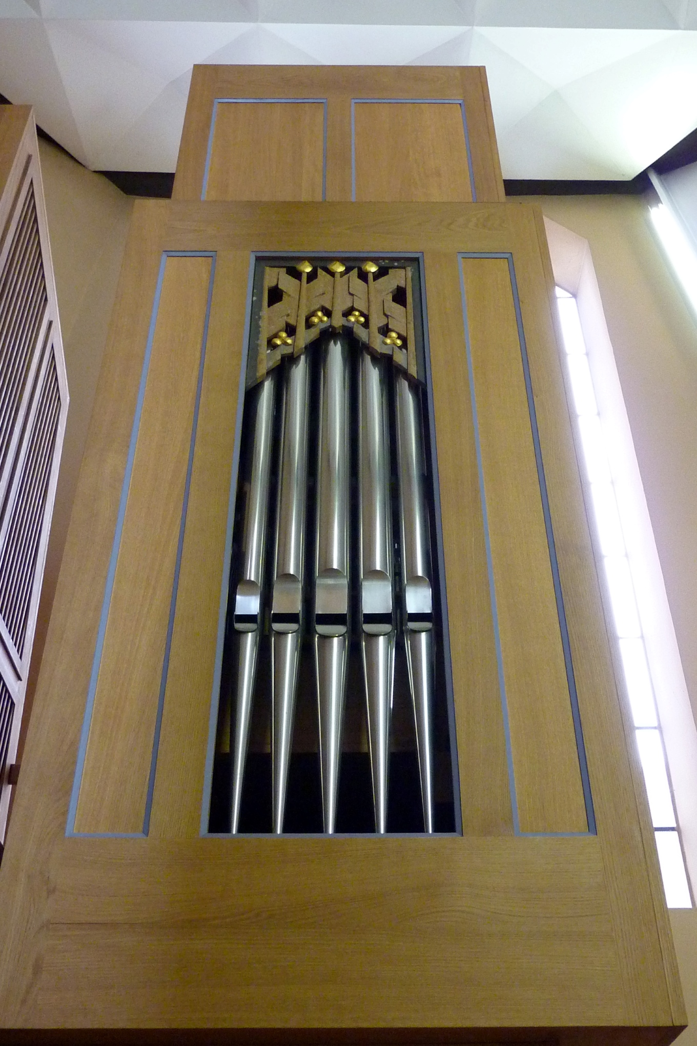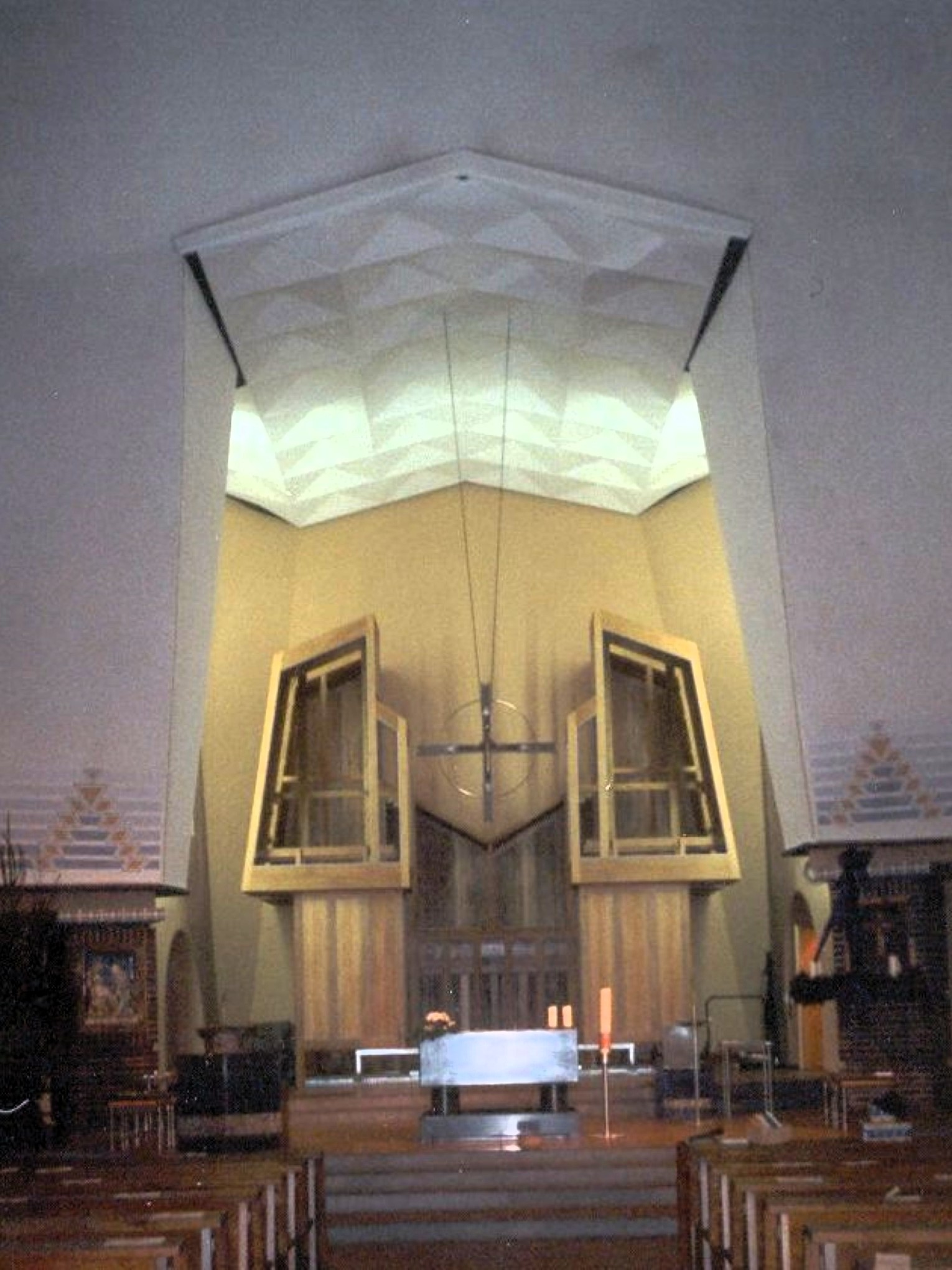 Die Prospektpfeifen der alten Orgel mussten aus Gründen des Denkmalschutzes stehen bleiben. Die Akustik der Kirche erweckt den Eindruck, dass die Orgel immer noch von der Orgelempore ertönt.