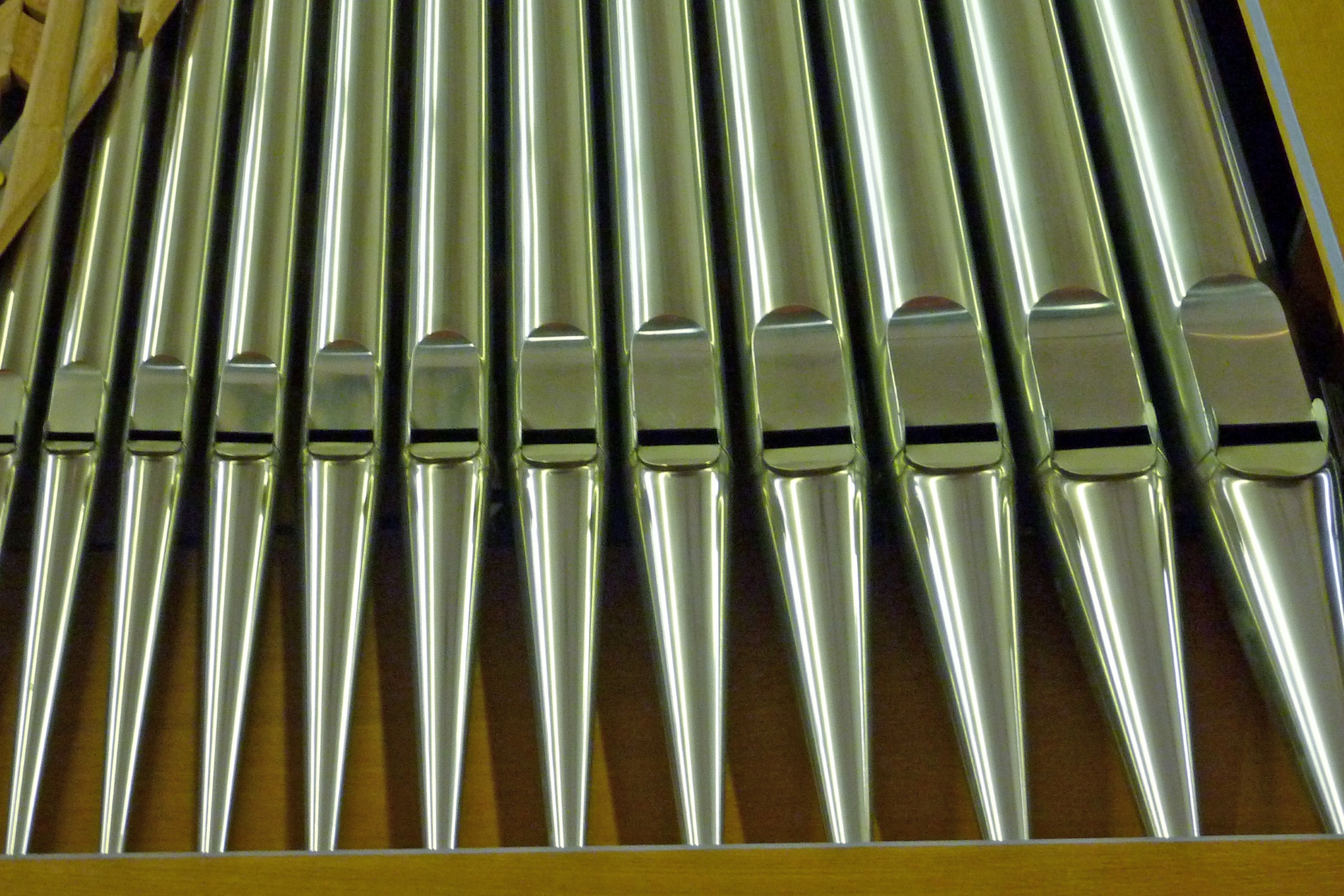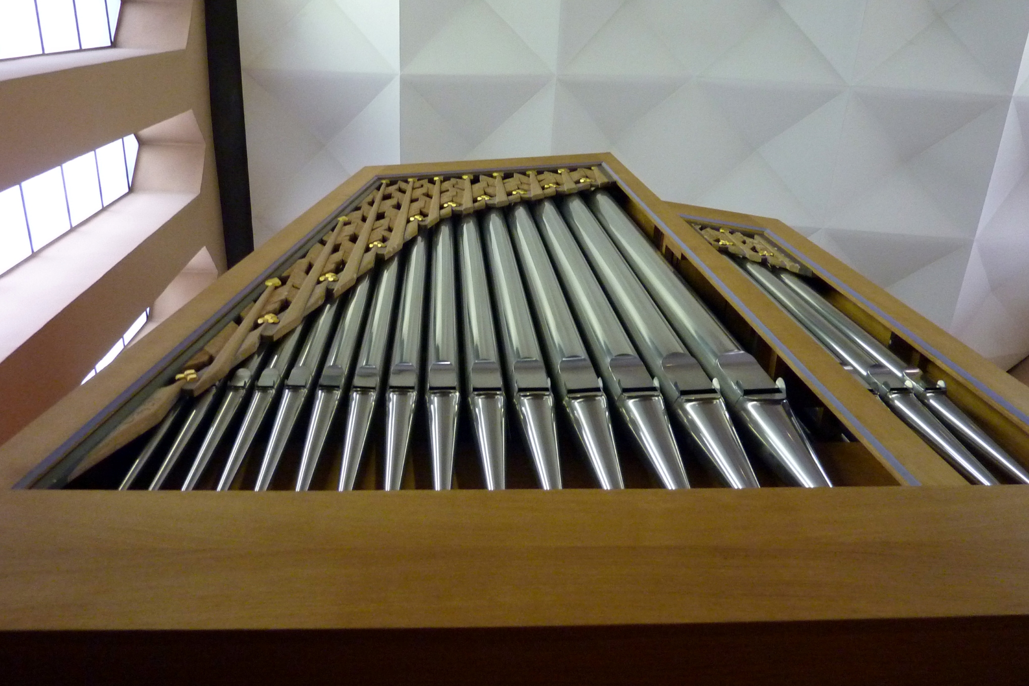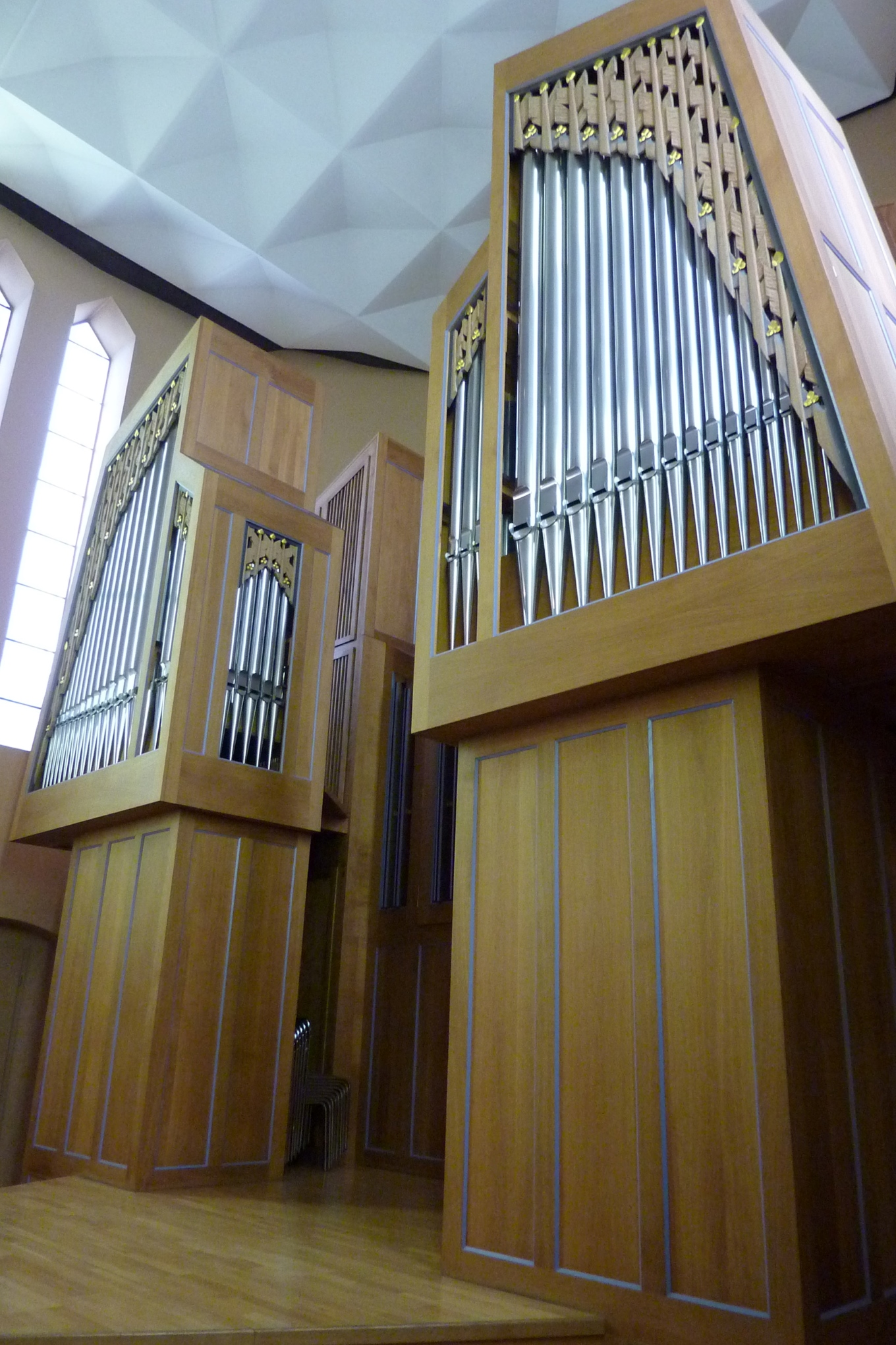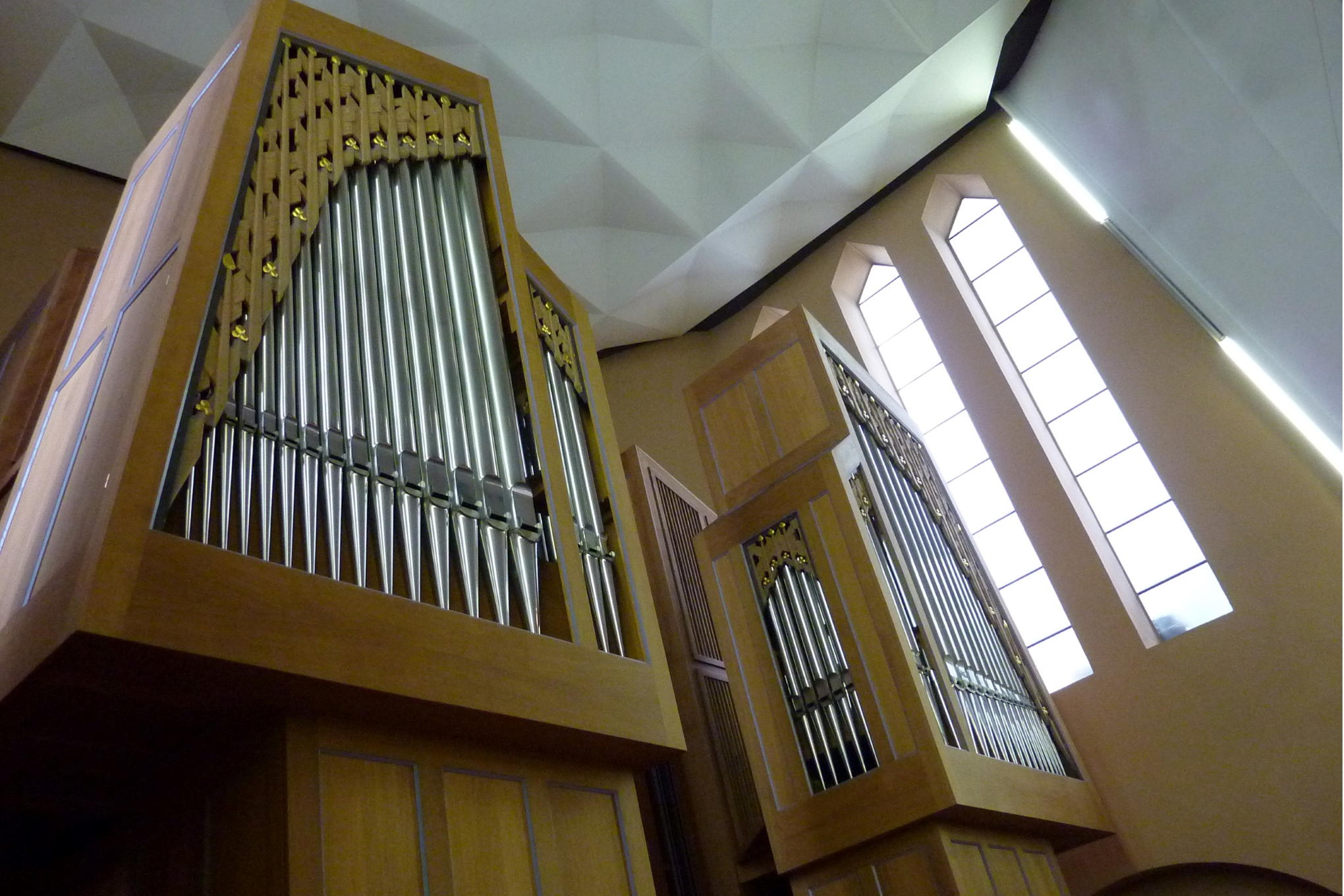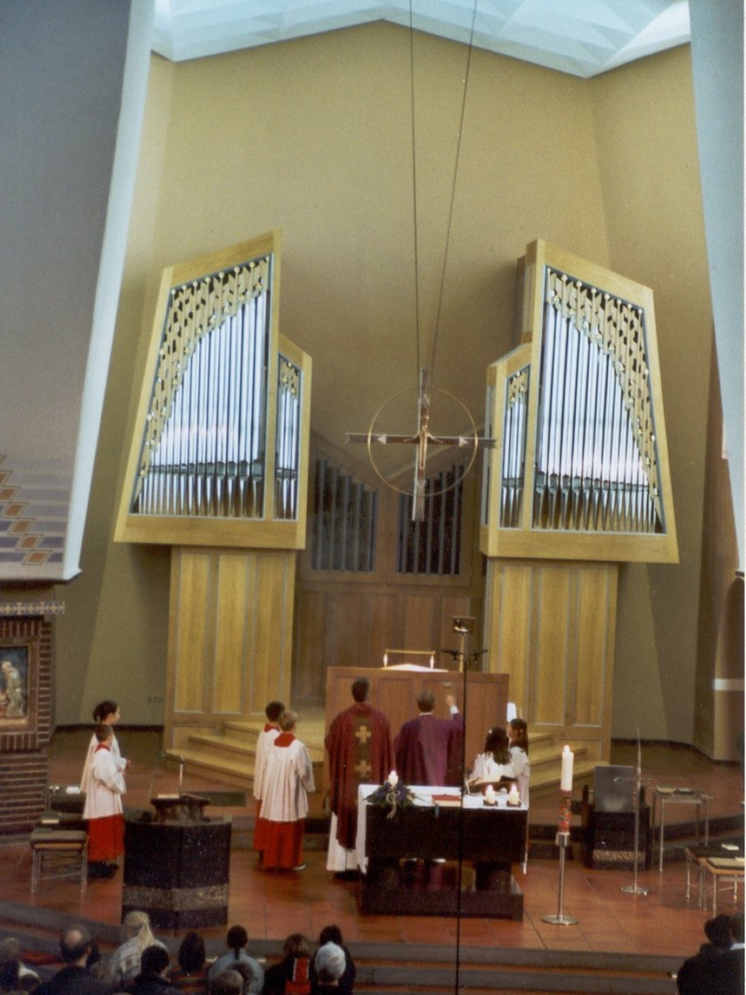 Die Prospektpfeifen der alten Orgel mussten aus Gründen des Denkmalschutzes stehen bleiben. Die Akustik der Kirche erweckt den Eindruck, dass die Orgel immer noch von der Orgelempore ertönt.