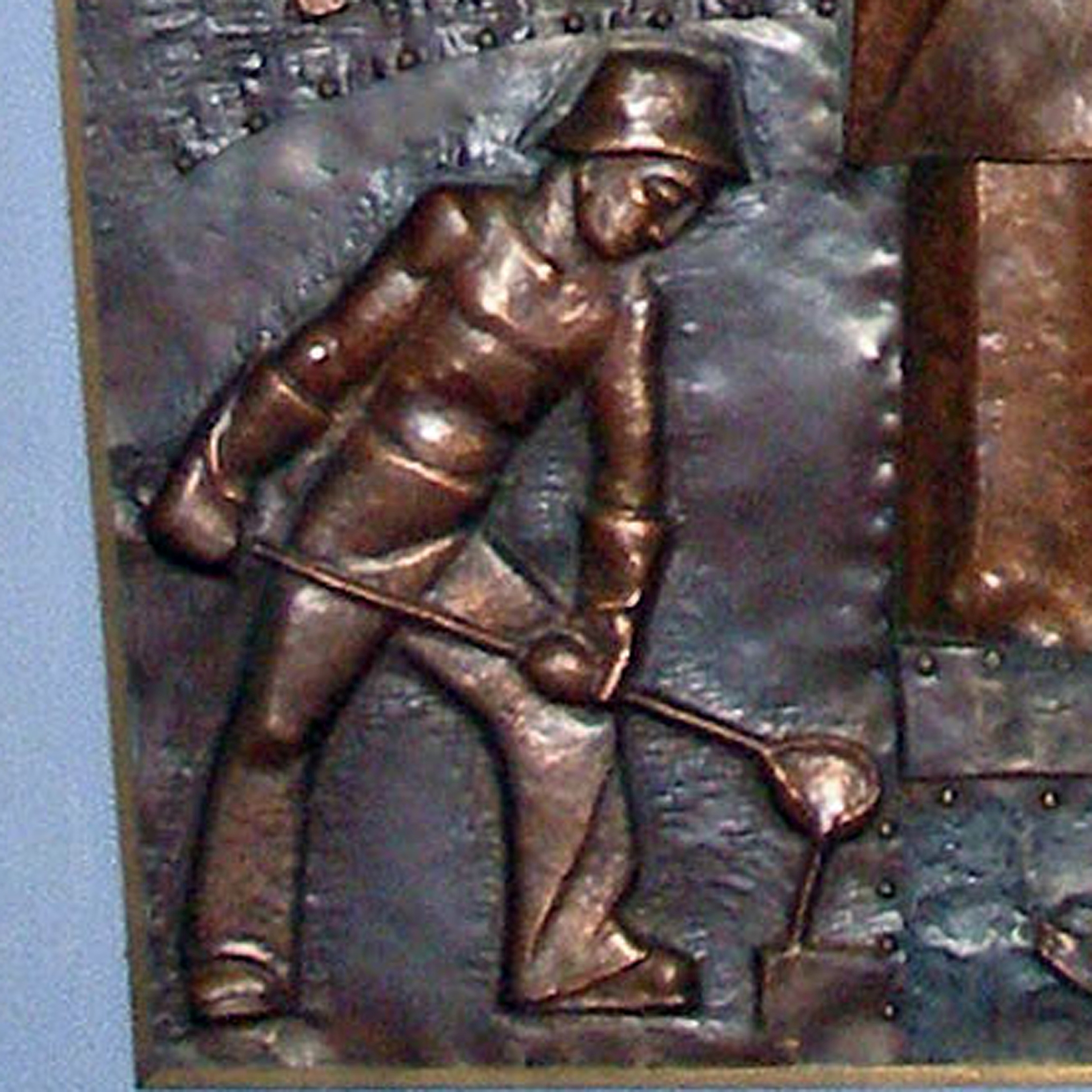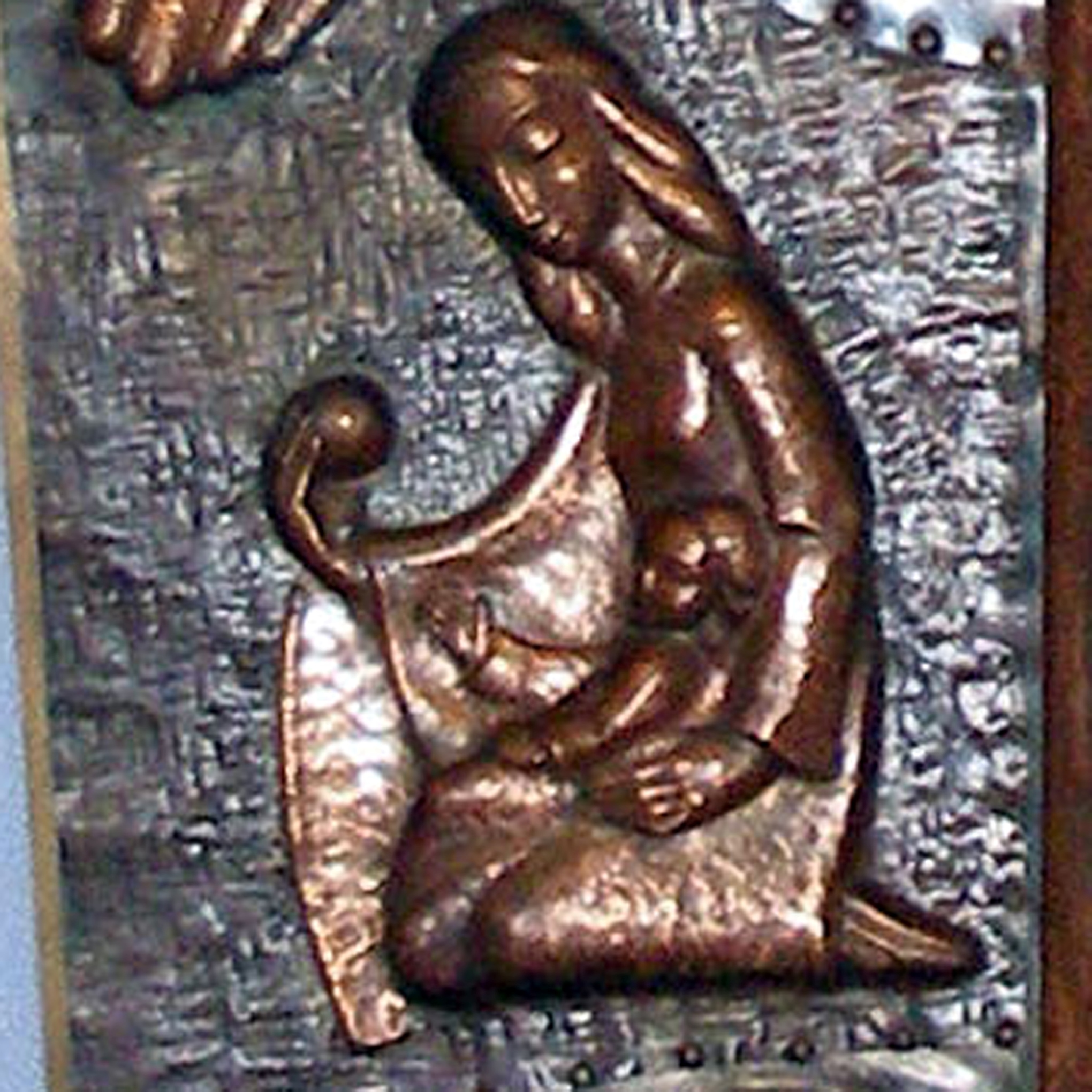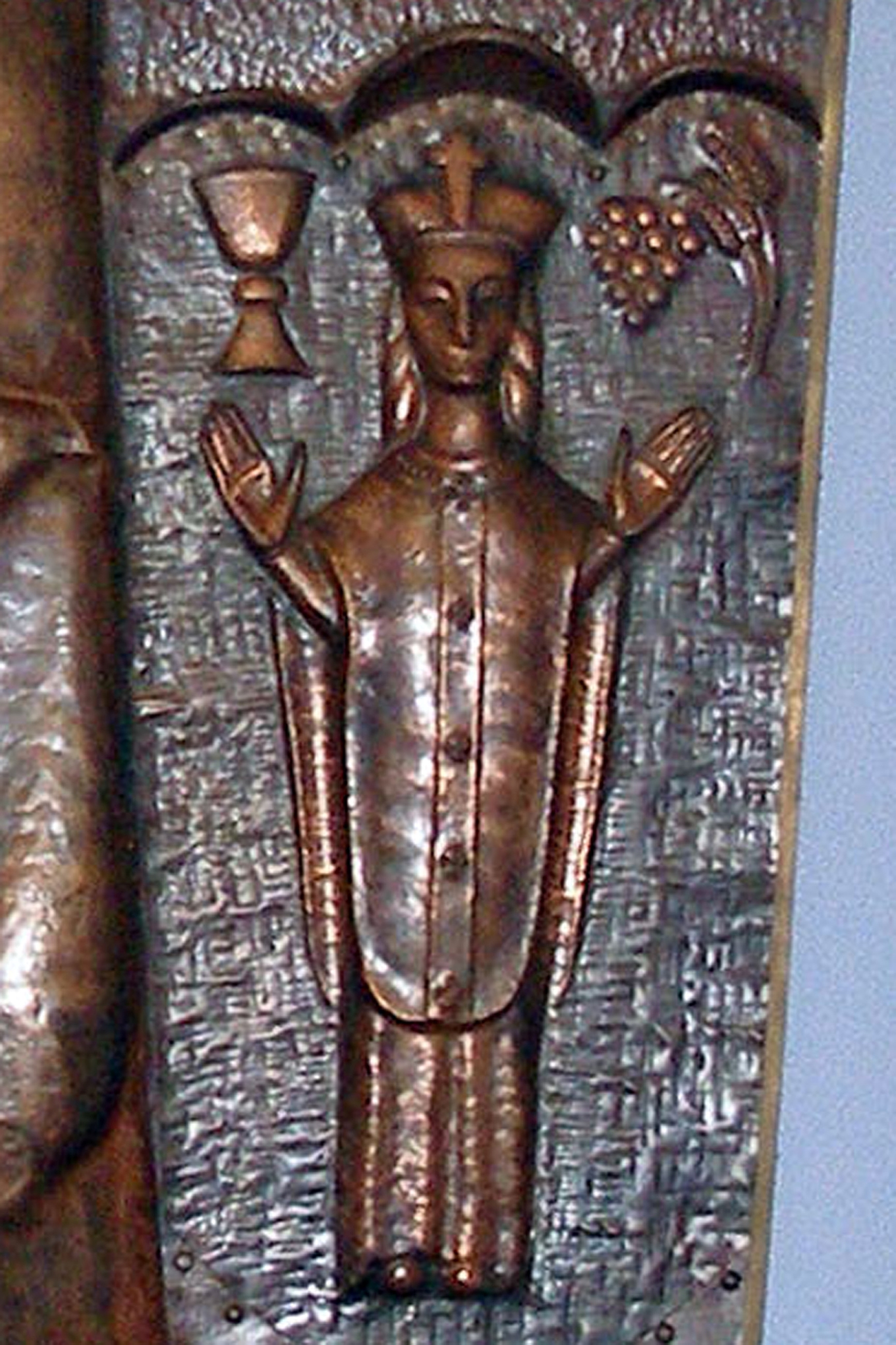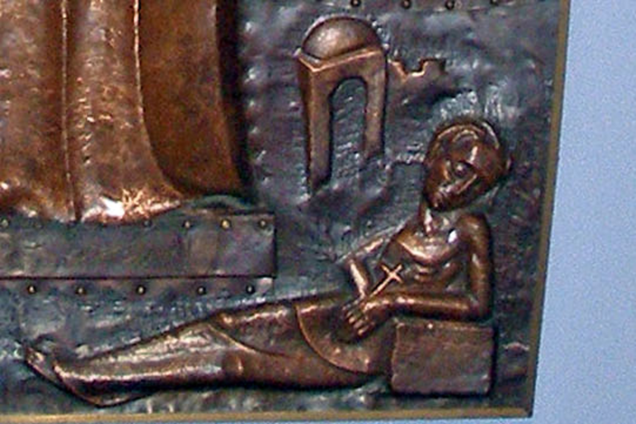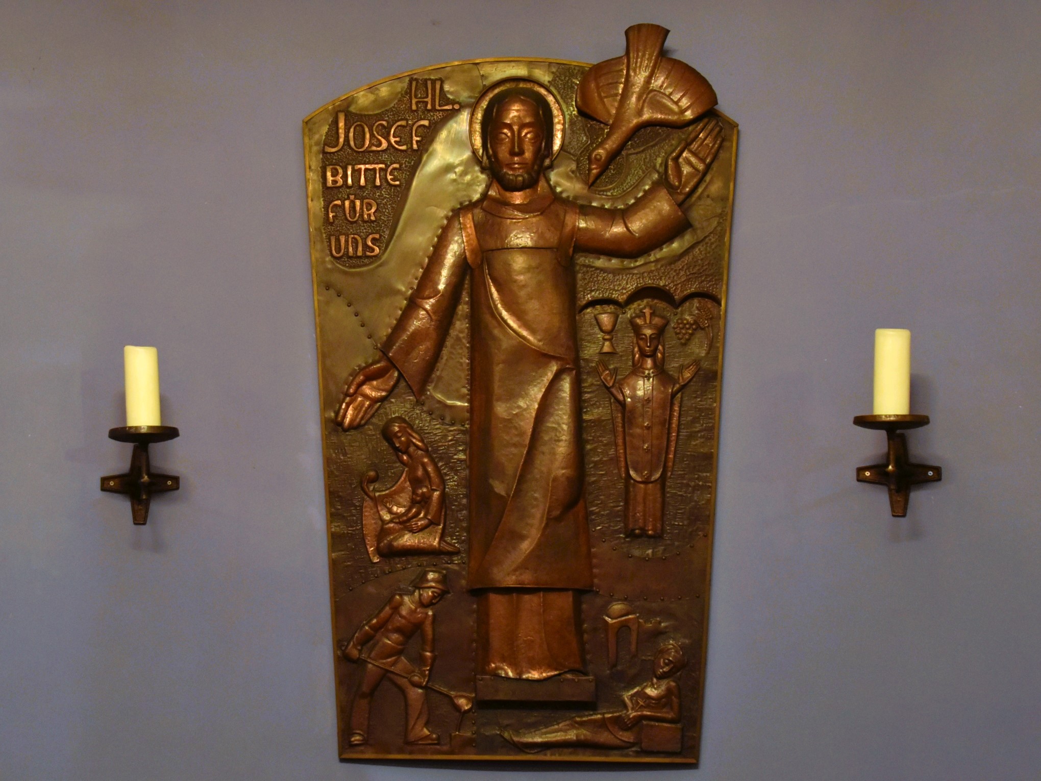 Zwischen den Fenstern hängt ein eindrucksvolles Bild des Hl. Josef, eine Kupfertreibarbeit von Karl Zangerle (Essen 1956), mit Bildern der vier Patronate des Hl. Josef: