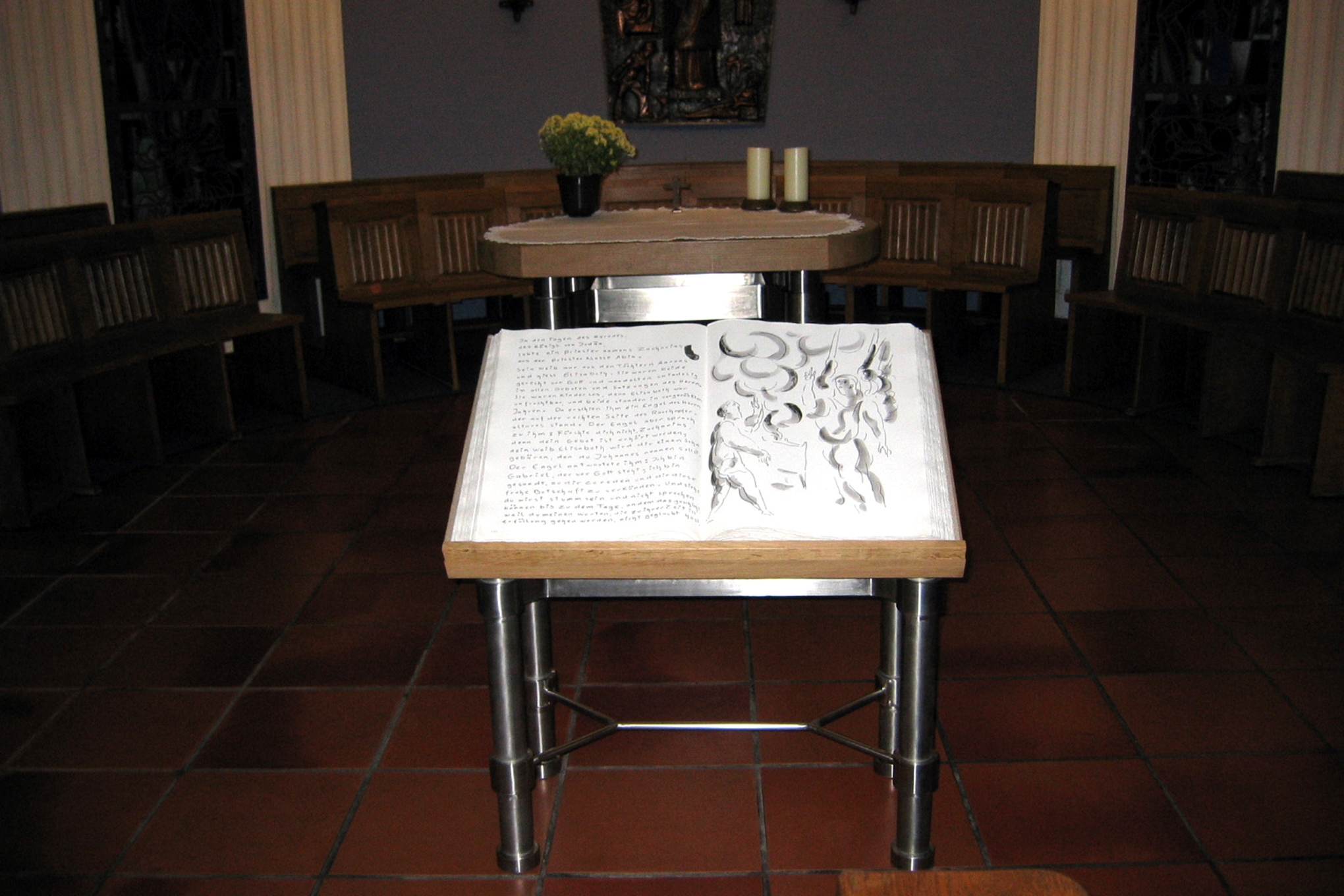 Die große Bibel auf dem Pult vor dem Altar wurde von H. G. Bücker (1964) gemalt und geschrieben.