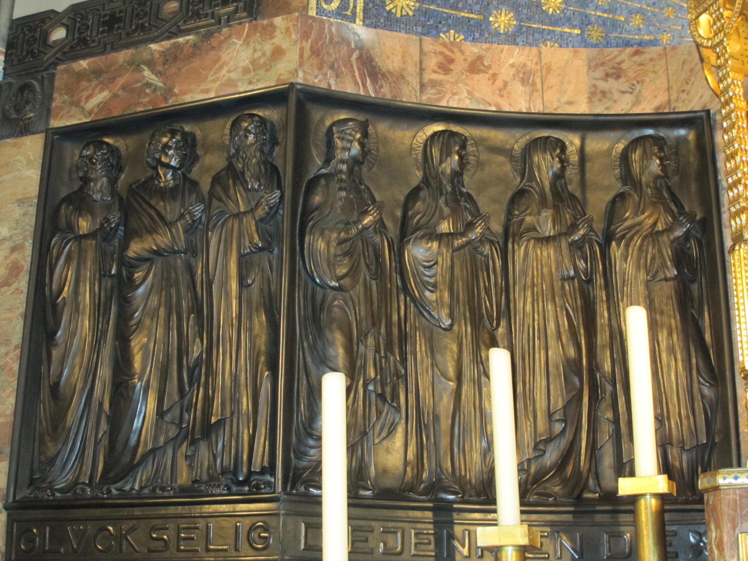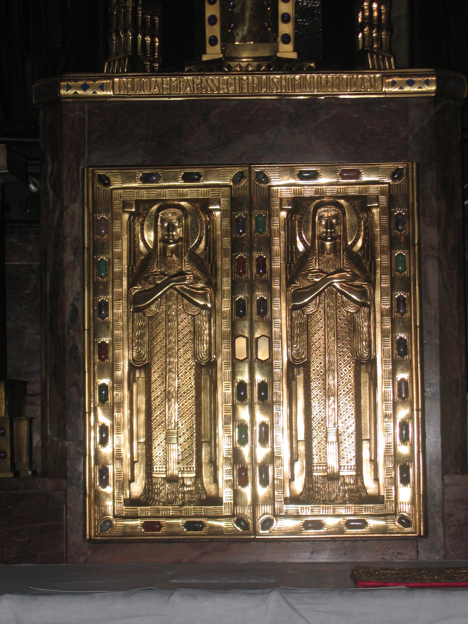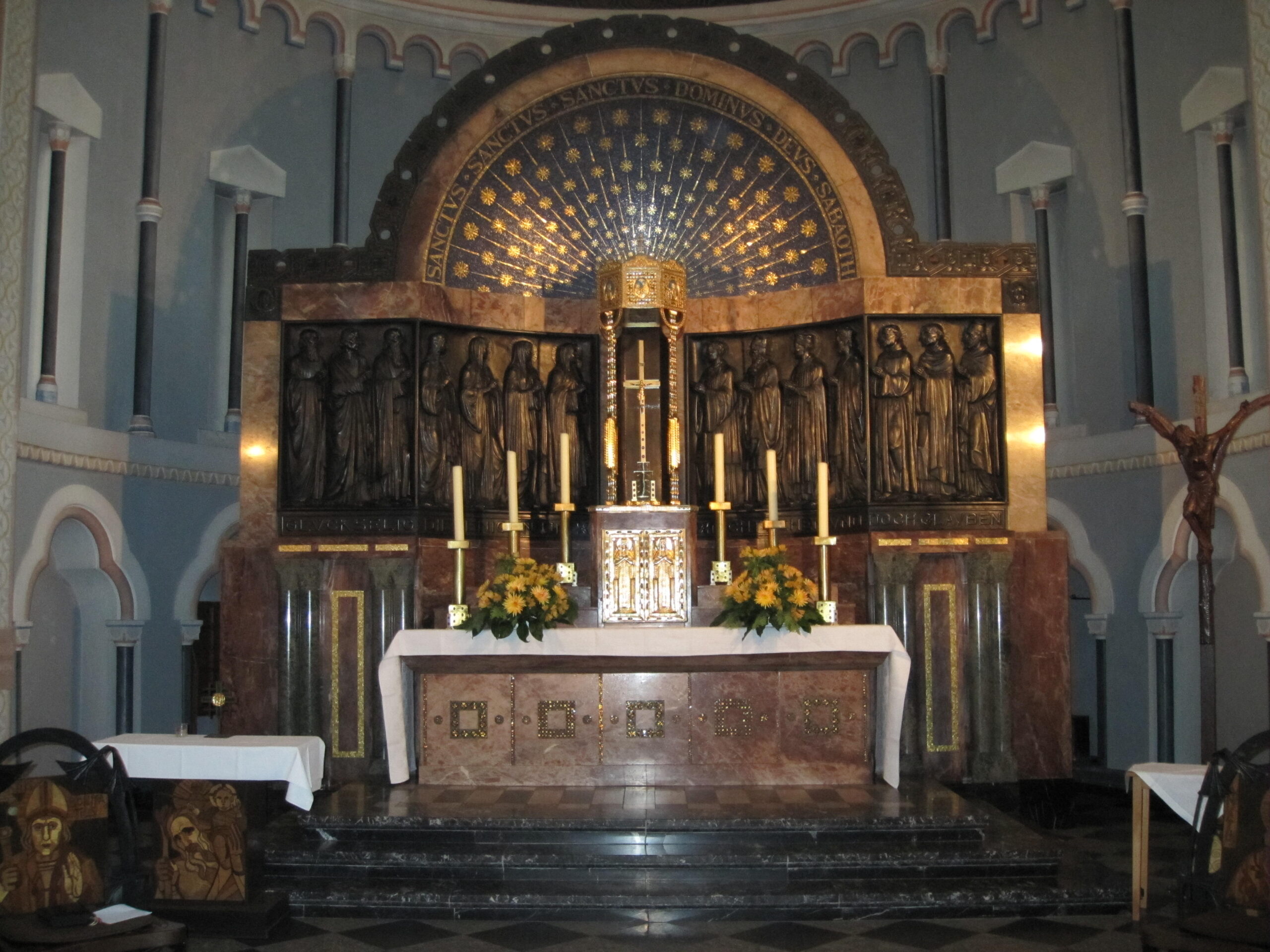 Der Altartisch wurde aus einem einzigen roten Marmorblock gefertigt. Darüber sind in kunstvoller schwarzer Kupfertreibarbeit 14 Heilige mit ihren Gedenktagen dargestellt: